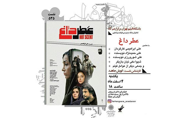 فیلم سینمایی «عطر داغ» به کارگردانی علی ابراهیمی یکشنبه 4 اسفند ماه 1398 ساعت 18 در فرهنگسرای ارسباران نمایش داده شده و پس از آن با حضور عوامل نقد و بررسی میشود.